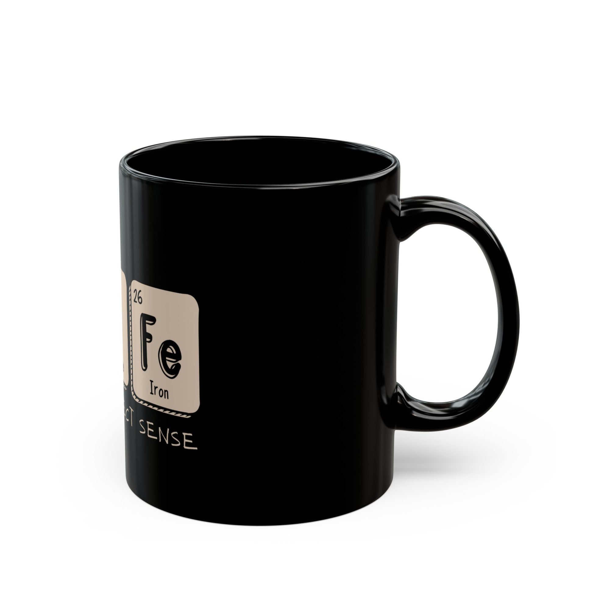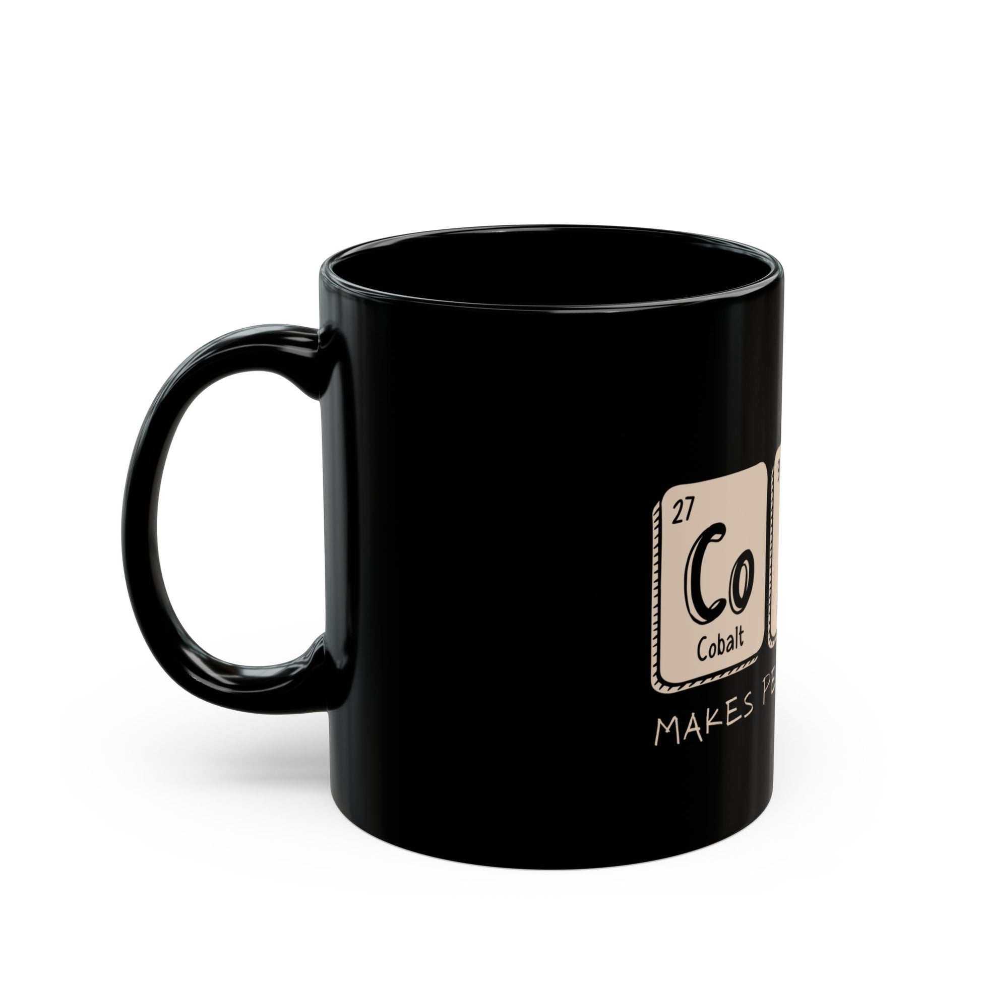 A black ceramic mug featuring the word 'coffee' spelled out using the periodic table, with text underneath saying 'makes perfect sense'. This mug is perfect for coffee lovers and science enthusiasts, adding a fun and quirky touch to your morning routine. Great for gifting on birthdays, holidays, or as a treat for yourself.