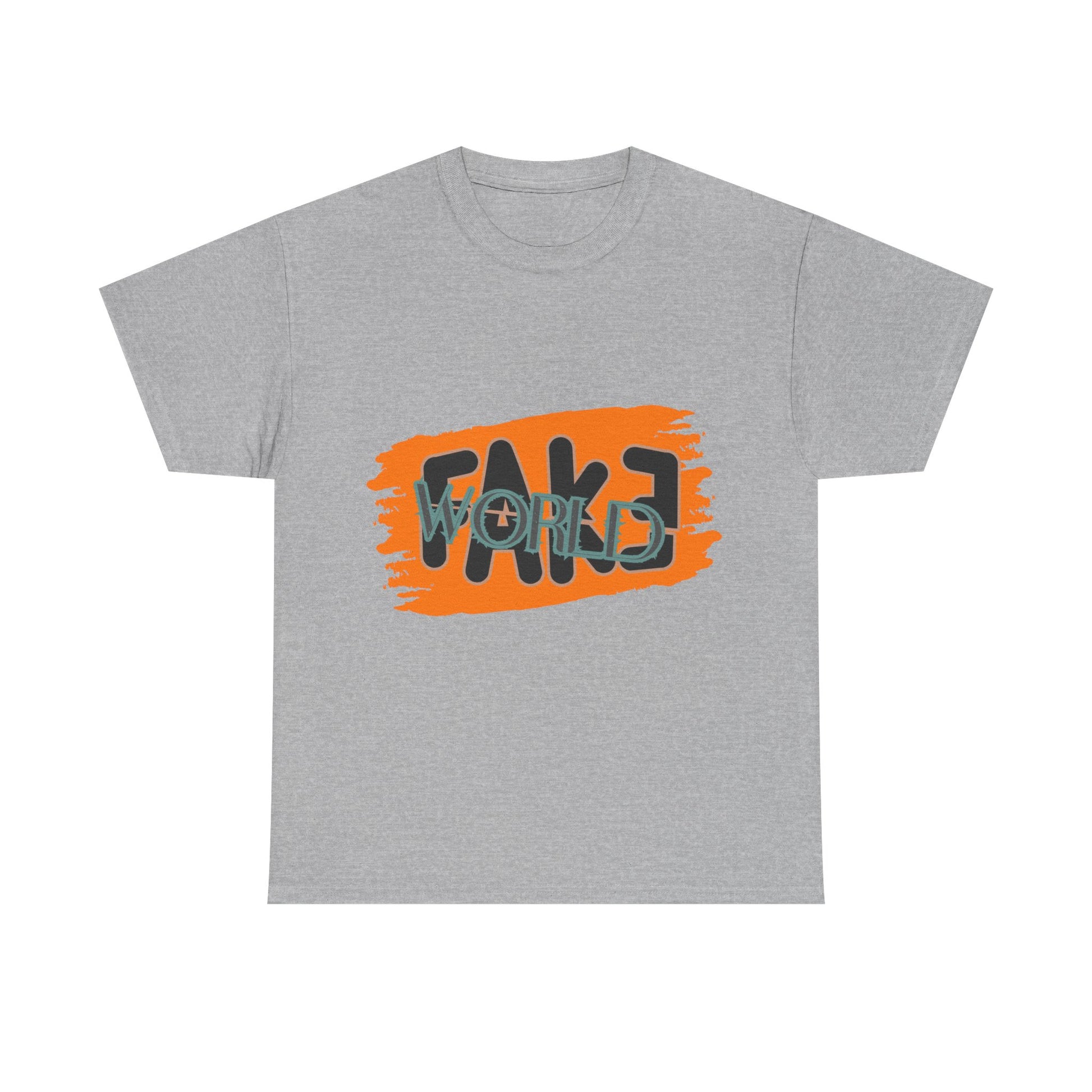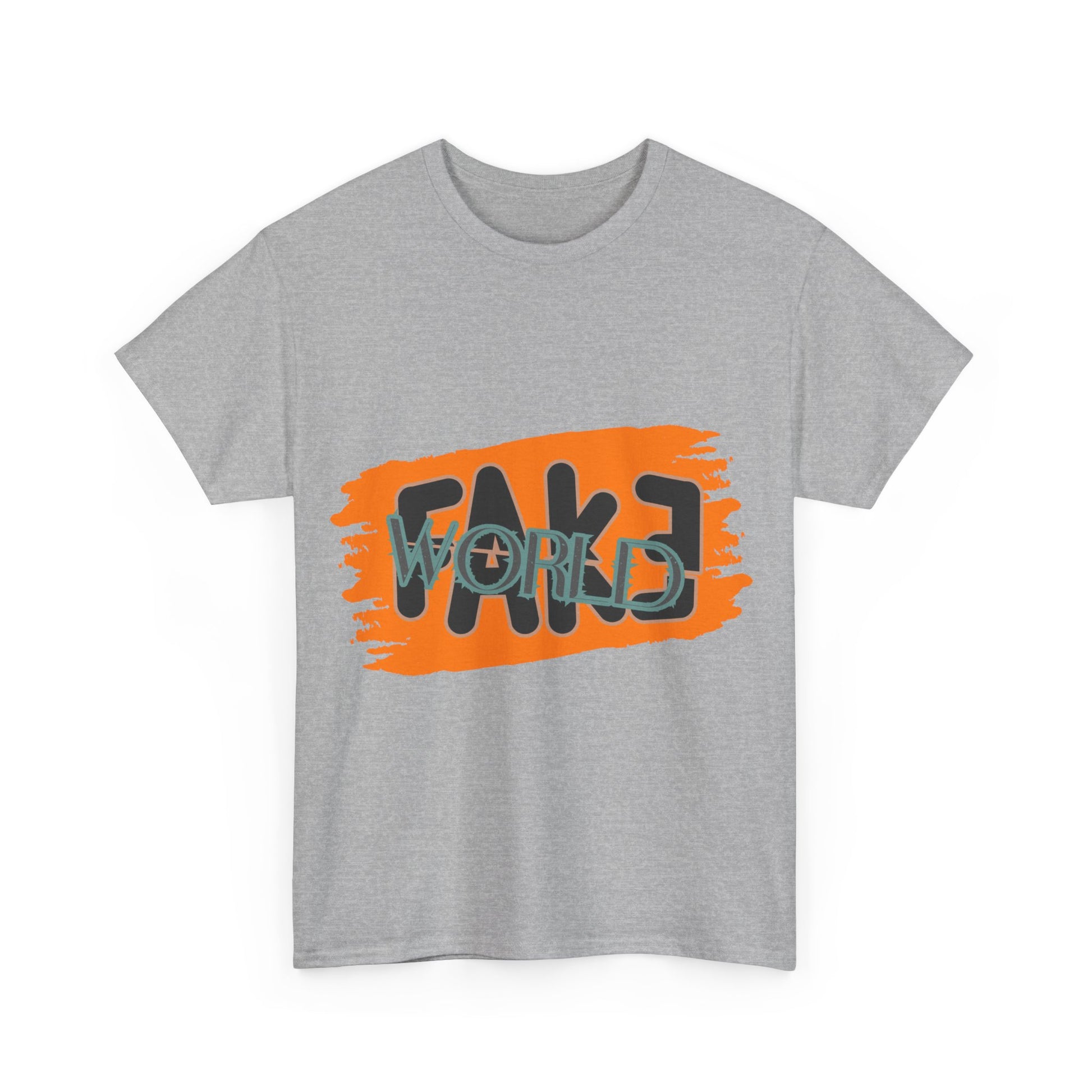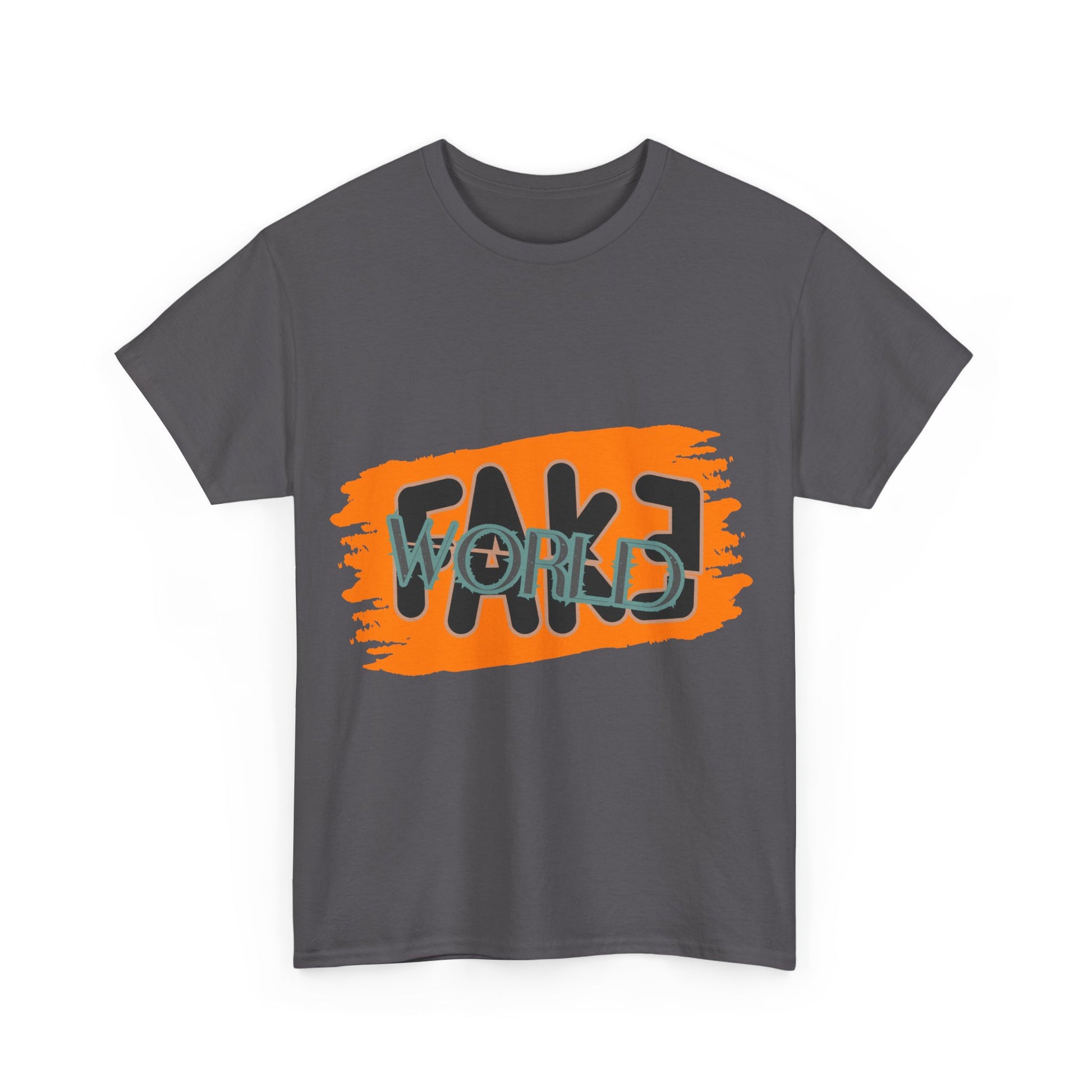 Trendy Graphic Tee - Unisex Heavy Cotton Tee with 'FAKE WORLD' Design, Casual Wear, Gift for Friends, Street Style, Summer Fashion