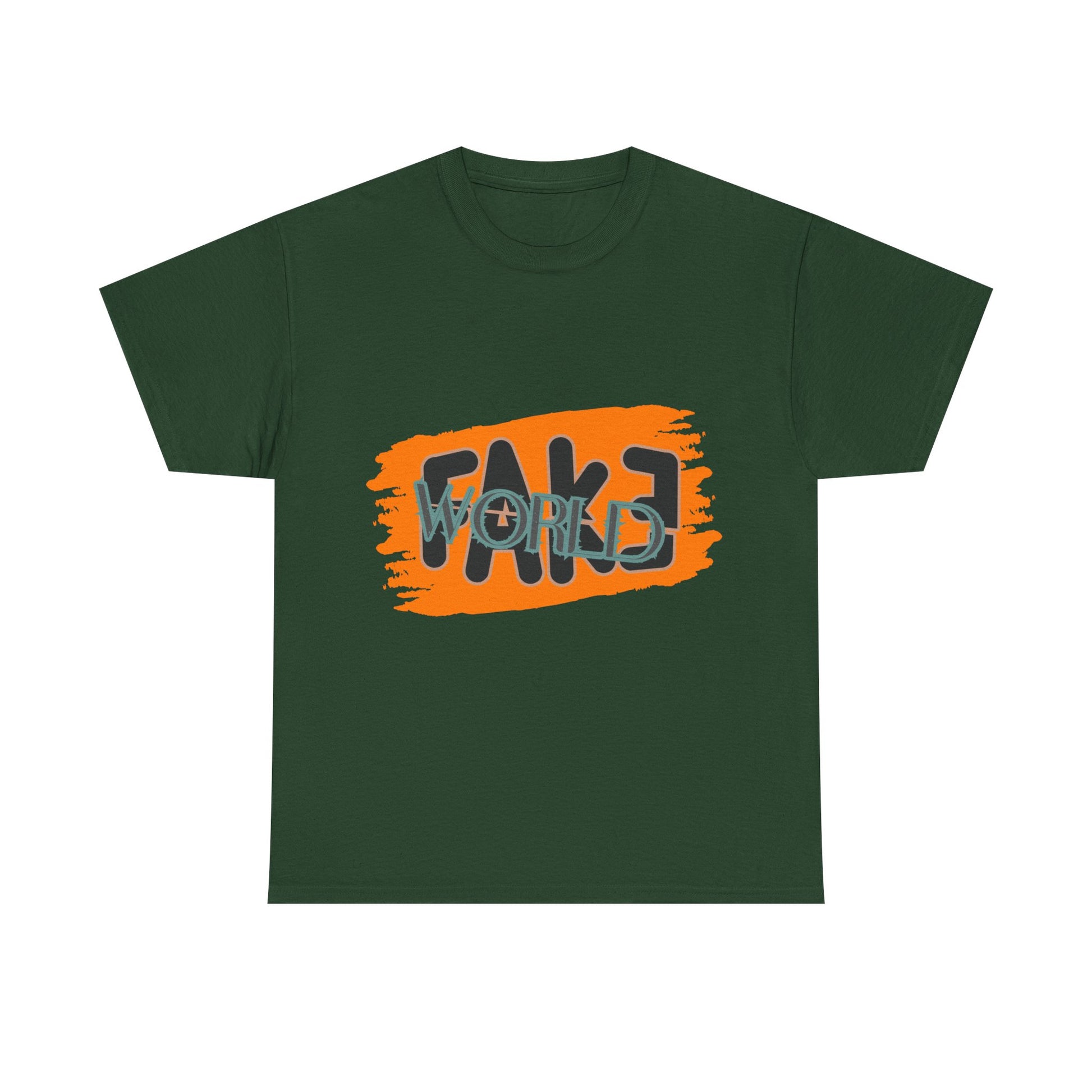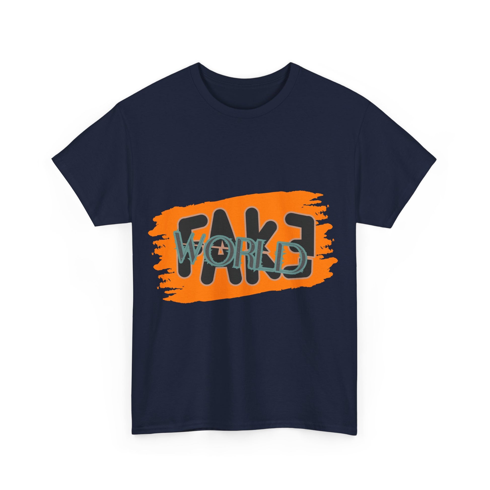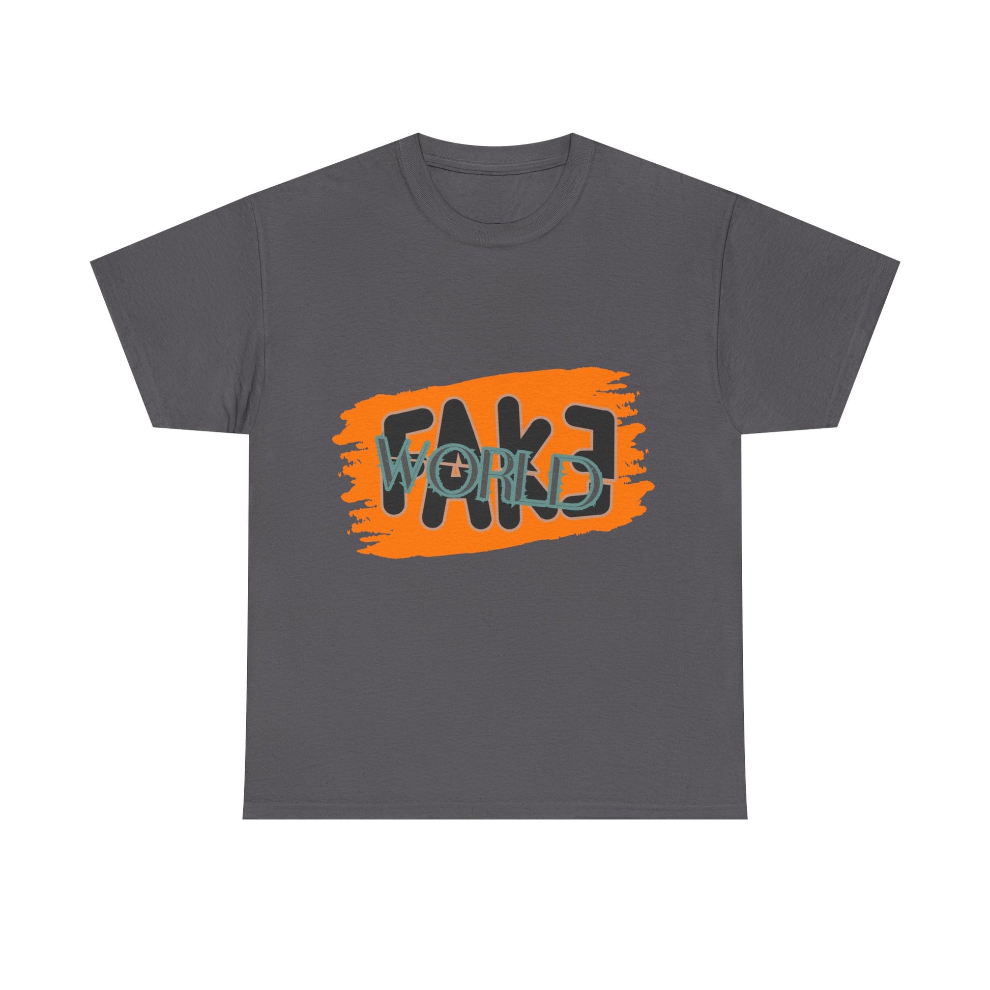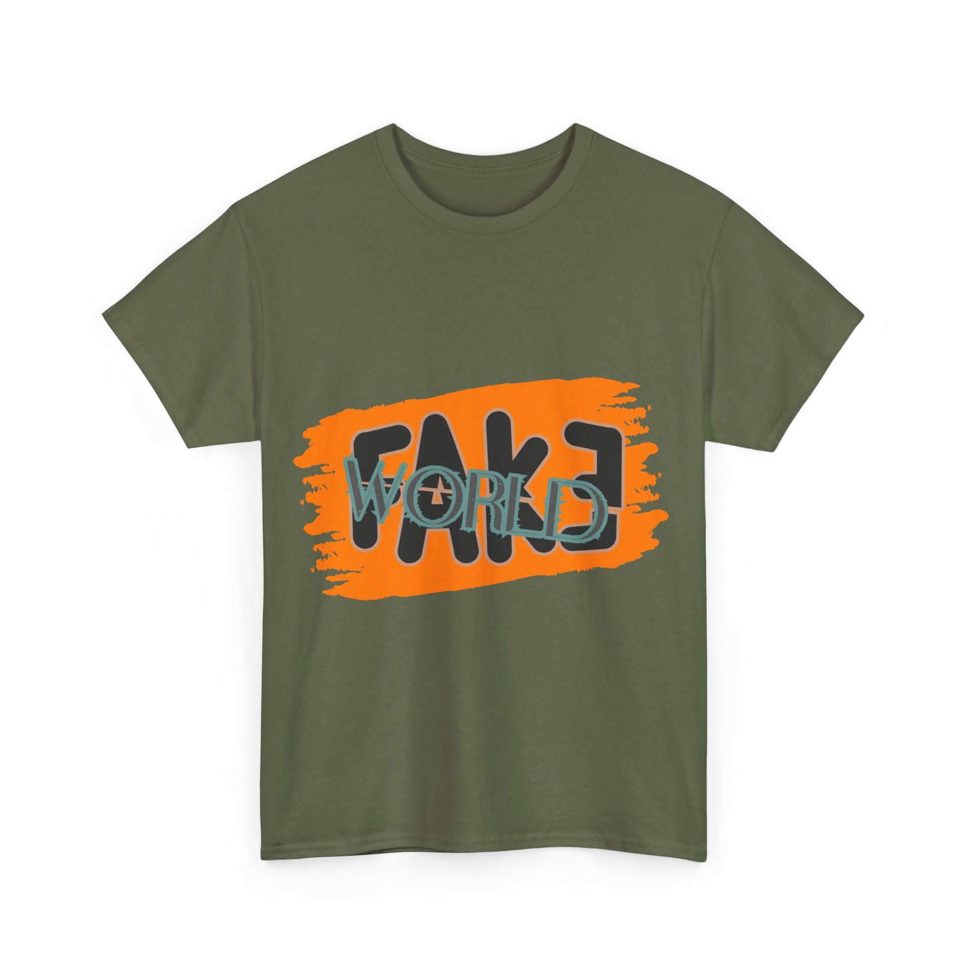 Trendy Graphic Tee - Unisex Heavy Cotton Tee with 'FAKE WORLD' Design, Casual Wear, Gift for Friends, Street Style, Summer Fashion